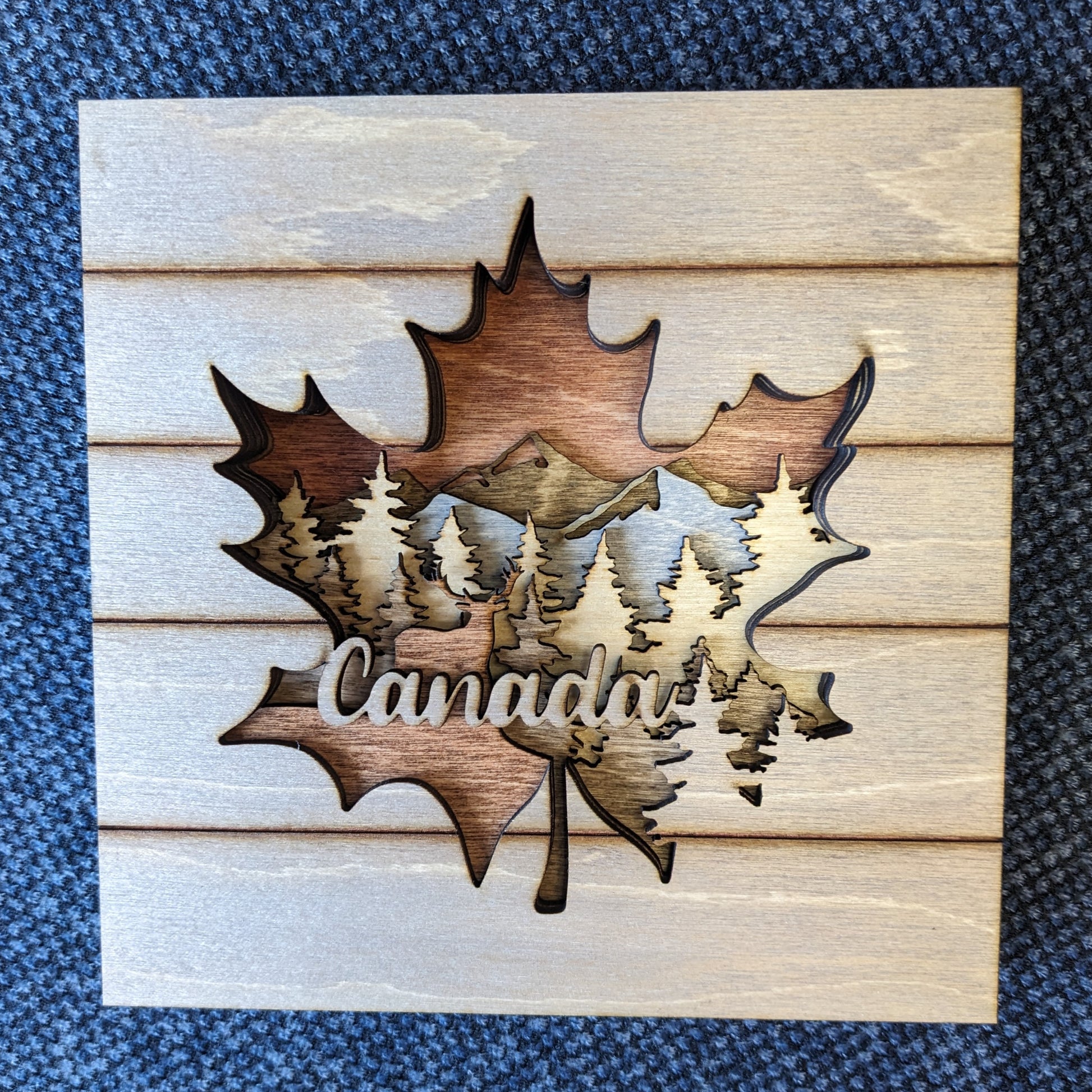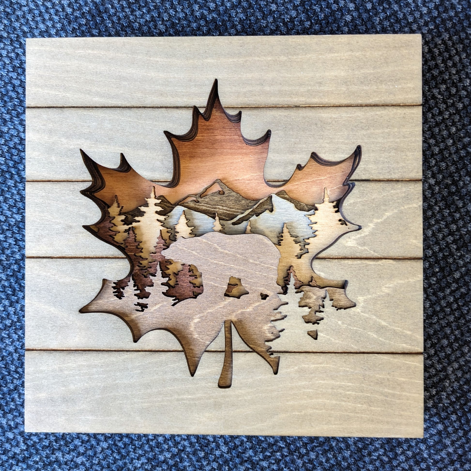 Add some Canadian charm to your space with our Maple Leaf art! These unique multilayer pieces feature a stunning Canadian maple leaf and mountains. Choose from two options: a classic Canada design or a playful bear motif. Perfect for displaying on a shelf or hanging on the wall. Get yours today, eh?