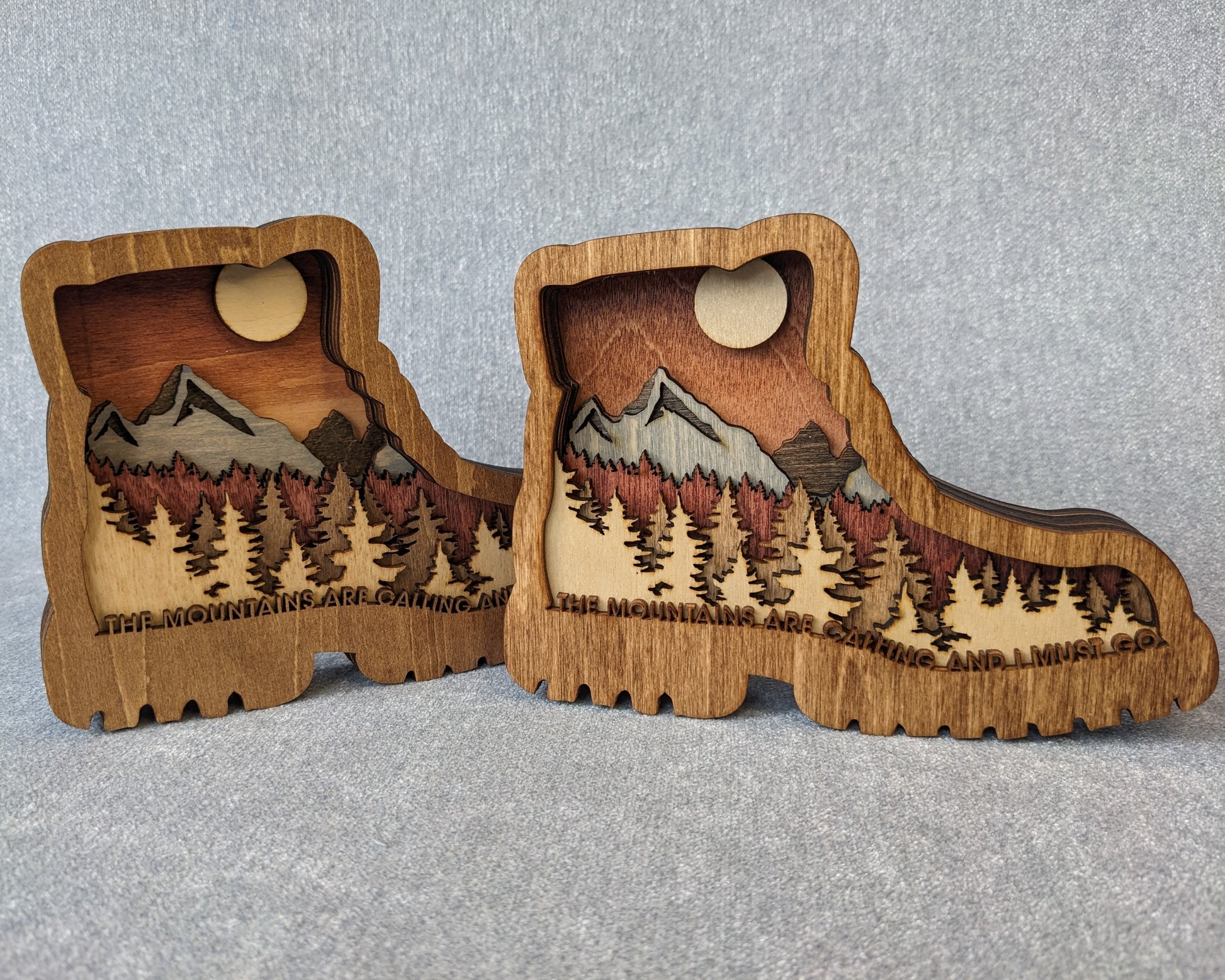 These "The mountains are calling" wood decorations are sure to stand out on your shelf. Featuring a hiking boot design and a multilayered structure, they are a fun way to show your love for the great outdoors. Don't resist the call of the mountains, let these unique decorations be a reminder to get outside and explore.